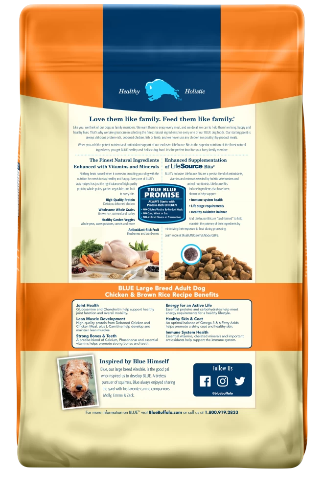 - A NATURAL DOG FOOD: BLUE Life Protection Formula® Large Breed Dog Food is made with the finest natural ingredients enhanced with vitamins and minerals. BLUE contains NO chicken (or poultry) by-product meals, corn, wheat, soy, artificial flavors or preservatives.