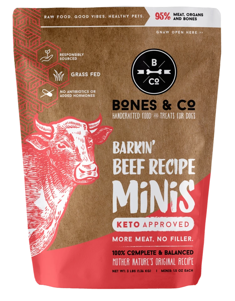 Our frozen, raw food is 95% meat bone, and organs, and 5% vegetables, vitamins, and minerals with a 1:1 fat to protein ratio, making it the most biologically and metabolically appropriate food.