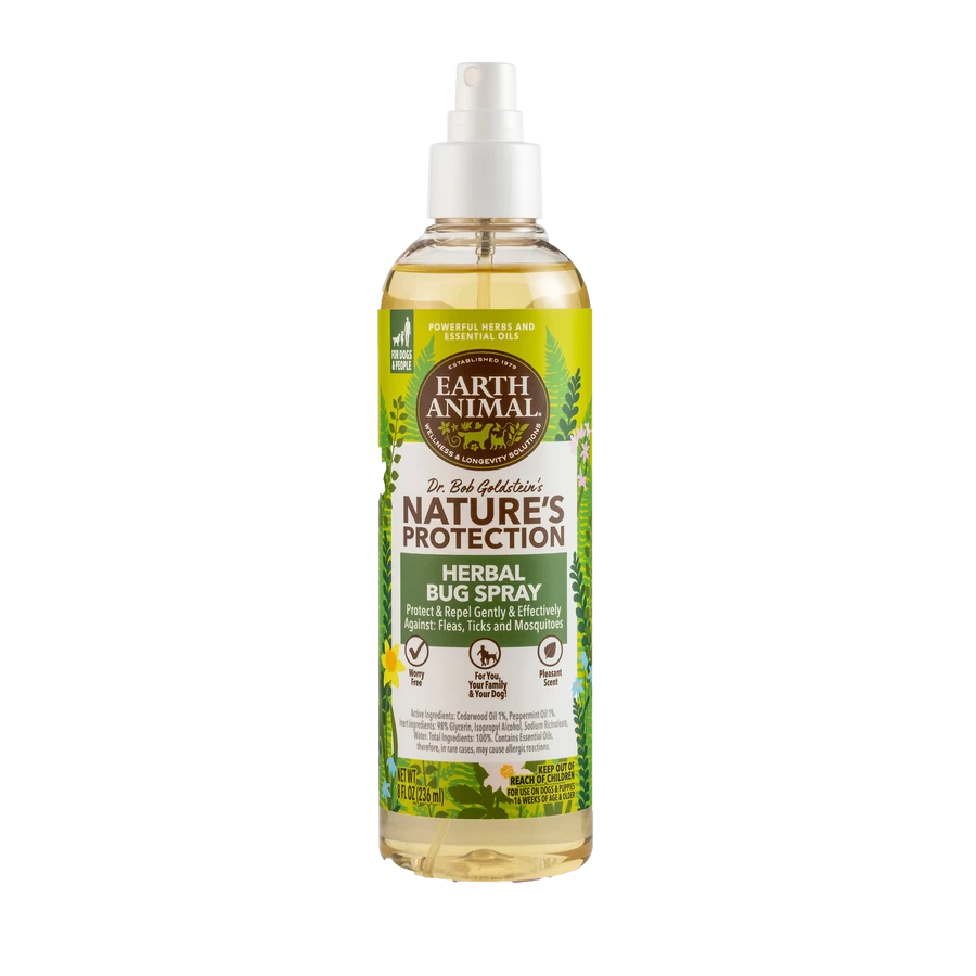 Formulated by Dr. Bob Goldstein, our Nature’s Protection™ Flea & Tick Herbal Bug Spray is infused with a natural blend of aromatic herbs and essential oils that have a fresh, minty fragrance. The preventative power and minty scent of these gentle oils are non-offensive to people and dogs, but loathed by fleas, ticks, and mosquitoes. Our spray is great for hikes, long walks, romps on the beach, boating, or simply lazy days in the yard. We suggest spraying the paws, underbelly, and gently mist the back and neck, daily. You should reapply if your dog swims. Shake well before use to activate the oils. The spray is safe for people too, especially kids, if used as directed.