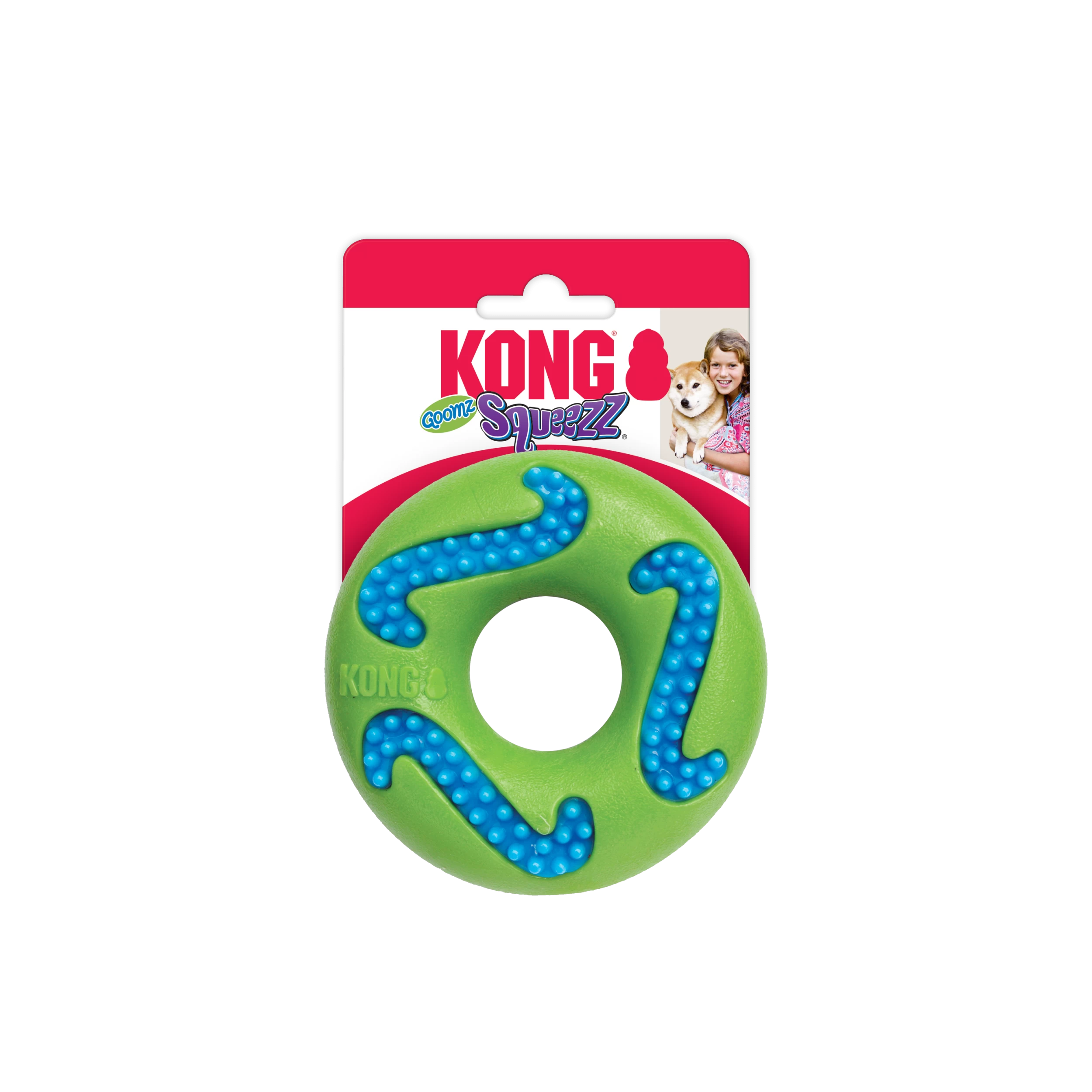 KONG Goomz ring’s enticing raised nubs massage teeth and gums while rewarding appropriate chewing behavior. Mixed textures and a durable material encourage on-going fun while satisfying natural instincts. The squeaker continues to extend playtime for indoor and outdoor sessions of interactive engagement.