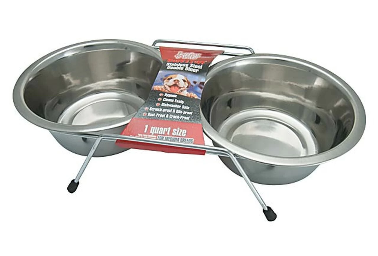 Ruff N’ Tuff® Double Diner stainless steel raised dog dishes are the perfect elevated dog diners. Both the frames and bowls are made of veterinarian recommended stainless steel. The frames feature removable rubber feet to prevent skidding, spilling and reduce noise. Because they are stainless they are durable, healthy, easy to clean, dishwasher safe, and bacteria resistant. Ruff N’ Tuff® Double Diners are also one of the most affordable raised dog dishes available. Available shrink-wrapped (packaged) and loose (bulk).