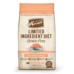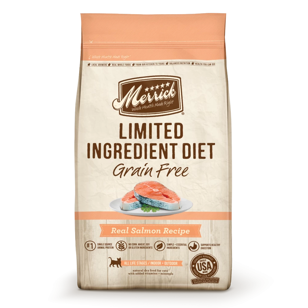 Merrick Limited Ingredient Diet Grain-Free Real Salmon Recipe Dry Cat Food aims to keep it simple with this limited ingredient recipe perfect for cats who may have a sensitivity or allergy towards certain ingredients. Merrick Limited Ingredient Diet Grain-Free Real Salmon Recipe Dry Cat Food contains balanced nutrition from a single source of animal protein and the fewest, most essential natural ingredients. This recipe is free of grains, corn, soy and gluten ingredients. The single source of protein helps to support healthy digestion and the high amounts of omega fatty acids promote the health of your cat’s skin and coat.