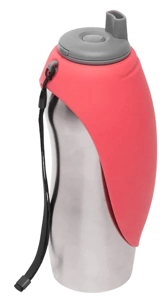 Our award winning travel water bottle and bowl is easy to use and ideal for walks, hikes and road trips. Just fold up the silicone bowl and press the quick release button to quench your messy mutt’s thirst! Unused water drains back into the stainless steel bottle after use and the bowl folds back over the bottle for easy portability.