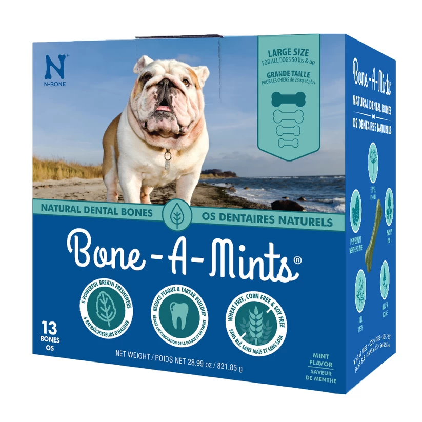 Do you love your dog but hate his stinky dog breath? With Bone-A-Mints®, you can love both! Bone-A-Mints® is a tasty treat that will help your pup get fresh breath instead of doggy breath. Bone-A-Mints® offer superior breath freshening performance, with five powerful and natural breath fresheners: peppermint, parsley, fennel, dill, and alfalfa. These tasty bones help whiten teeth by reducing plaque and tartar build-up as your four-legged friend chews. Bone-A-Mints® are made wheat free, corn free and soy free, so pups with sensitive stomachs can enjoy them too! Bone-A-Mints® are the most powerful breath freshening treats around. Say goodbye to stinky breath and hello to sweet, effervescent doggy kisses.