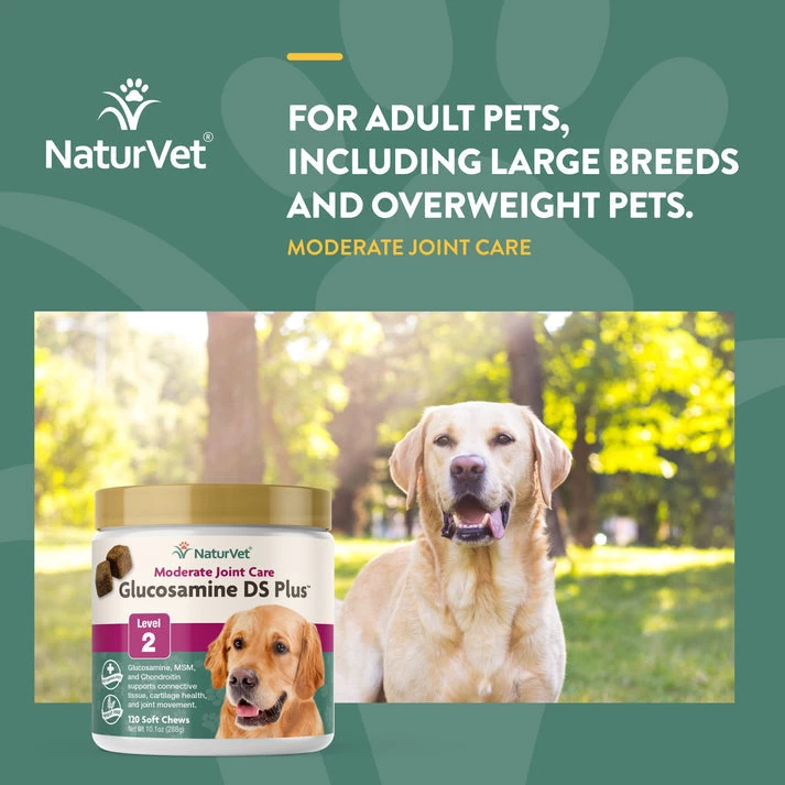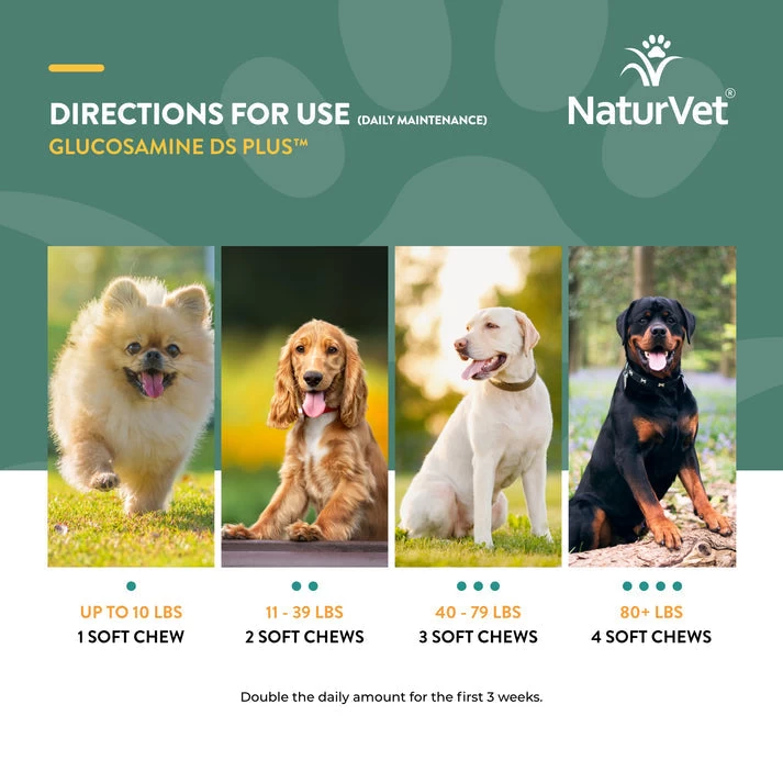 Glucosamine DS Plus™ Soft Chews are for use in dogs and cats over the age of 12 weeks. Glucosamine, MSM, Chondroitin, and antioxidants help to support connective tissue, cartilage health, joint movement, and lubrication of joints. Recommended for adult pets, including large breeds and overweight pets.