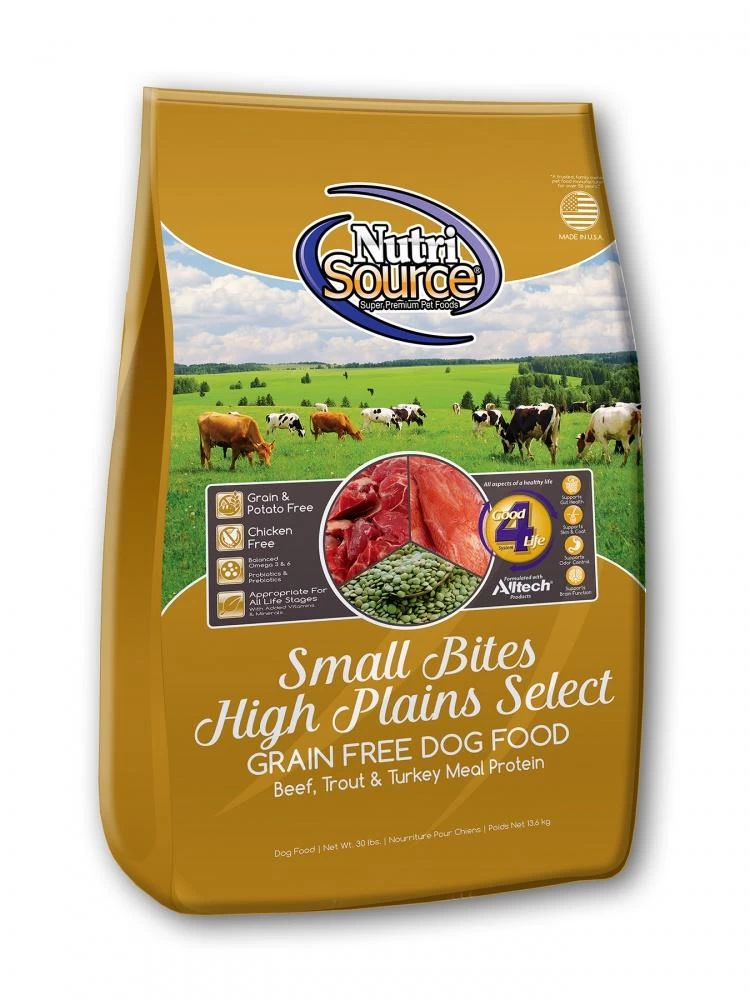 NutriSource Grain Free High Plains Select Small Bites Dry Dog Food utilizes a holistic, easy to digest recipe with smaller kibble pieces for ideal health maintenance in all breeds and life stages. This grain free recipe is made with fresh, animal protein from the USA along with other high quality ingredients providing perfectly balanced nutrition your pup is sure to love! Nutrisource recipes always include their Good 4 Life system with ingredients that work together to promote gut health often showing health improvements within the first feeding!