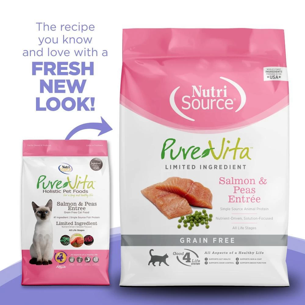 PureVita™ Brand Grain Free Salmon Entree combines the delicious taste of salmon with a variety of nutritious fruits and vegetables. And because it is made by NutriSource®, you can be sure it has our exclusive “Good 4 Life” system and the finest quality ingredients available for your cat or kitten.