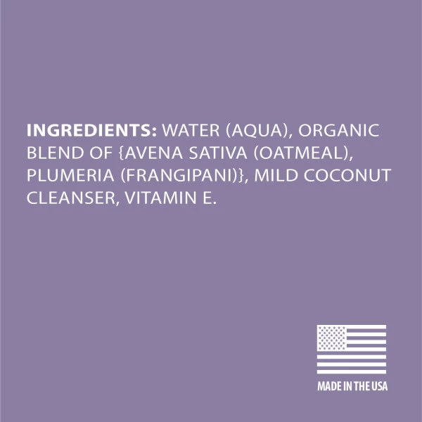 Water (Aqua), Organic Blend of {Avena Sativa (Oatmeal), Plumeria (Frangipani)}, Mild Coconut Cleanser, Vitamin E