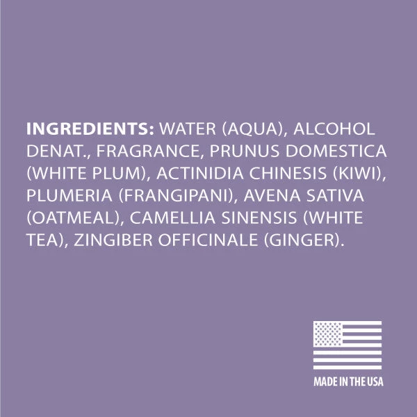 Water (Aqua), Alcohol Denat., Fragrance, Prunus Domestica (White Plum), Actinidia Chinesis (Kiwi), Plumeria (Frangipani), Avena Sativa (Oatmeal), Camellia Sinensis (White Tea), Zingiber Officinale (Ginger)