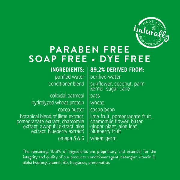 Water, Conditioner Blend, Colloidal Oatmeal, Hydrolyzed Wheat Protein, Cocoa Butter, Botanical Blend Of (Lime Extract, Pomegranate Extract, Chamomile Extract, Awapuhi Extract, Aloe Extract, Blueberry Extract), Omega 3 & 6, Conditioner Agent, Detangler, Vitamin E, Alpha Hydroxy, Vitamin B5, Fragrance, Preservative.