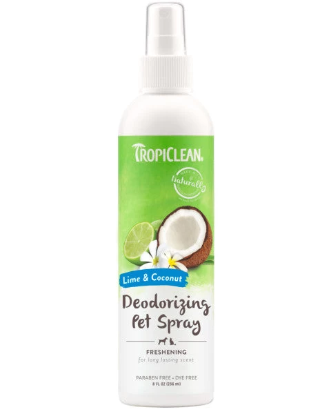 TropiClean Deodorizing Pet Spray conditions and soothes as it breaks down bad smells at their source, effectively refreshing your dog, cat, and home. The pleasant scent of lime and coconut leaves your pet smelling fresh and ready for cuddles!