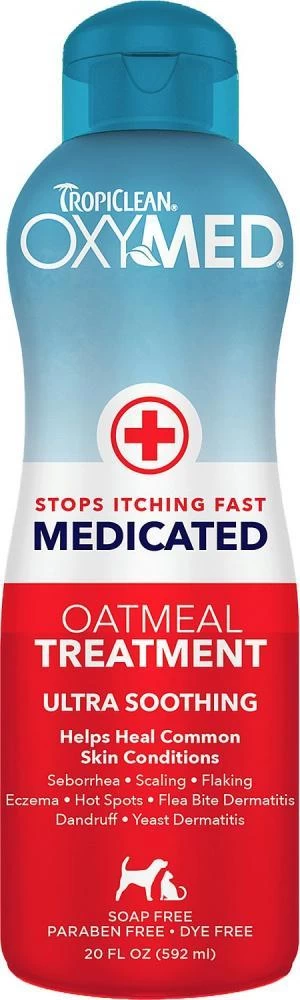 OxyMed Medicated Oatmeal Treatment contains a powerful combination of alpha hydroxy, beta hydroxy, and omega-3 & -6 fatty acids that helps penetrate deep into the pores, exfoliating the skin to help restore moisture. The nourishing oatmeal conditioner contains vitamins, chamomile, and aloe to condition the skin and coat and provide ultra-soothing relief.