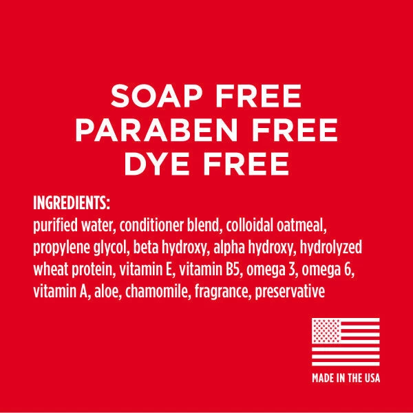 Water, Conditioner Blend, Colloidal Oatmeal, Propylene Glycol, Beta Hydroxy, Alpha Hydroxy, Hydrolyzed Wheat Protein, Vitamin E, Vitamin B5, Omega 3, Omega 6, Vitamin A, Aloe, Chamomile, Fragrance, Preservative