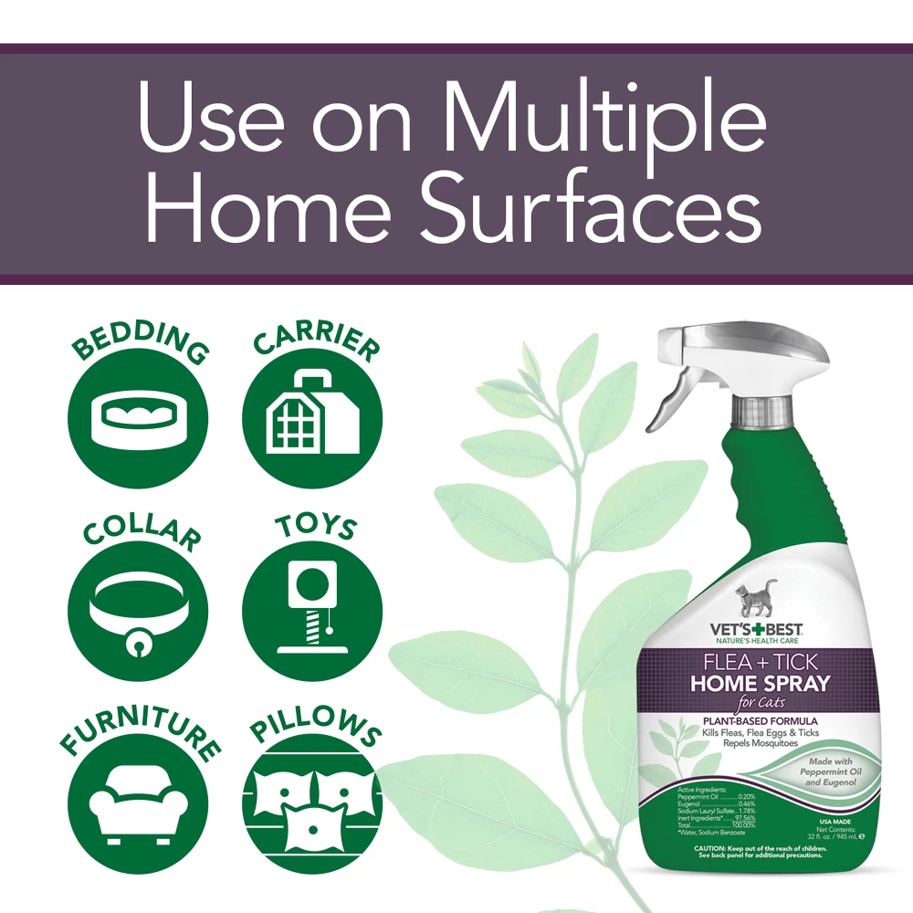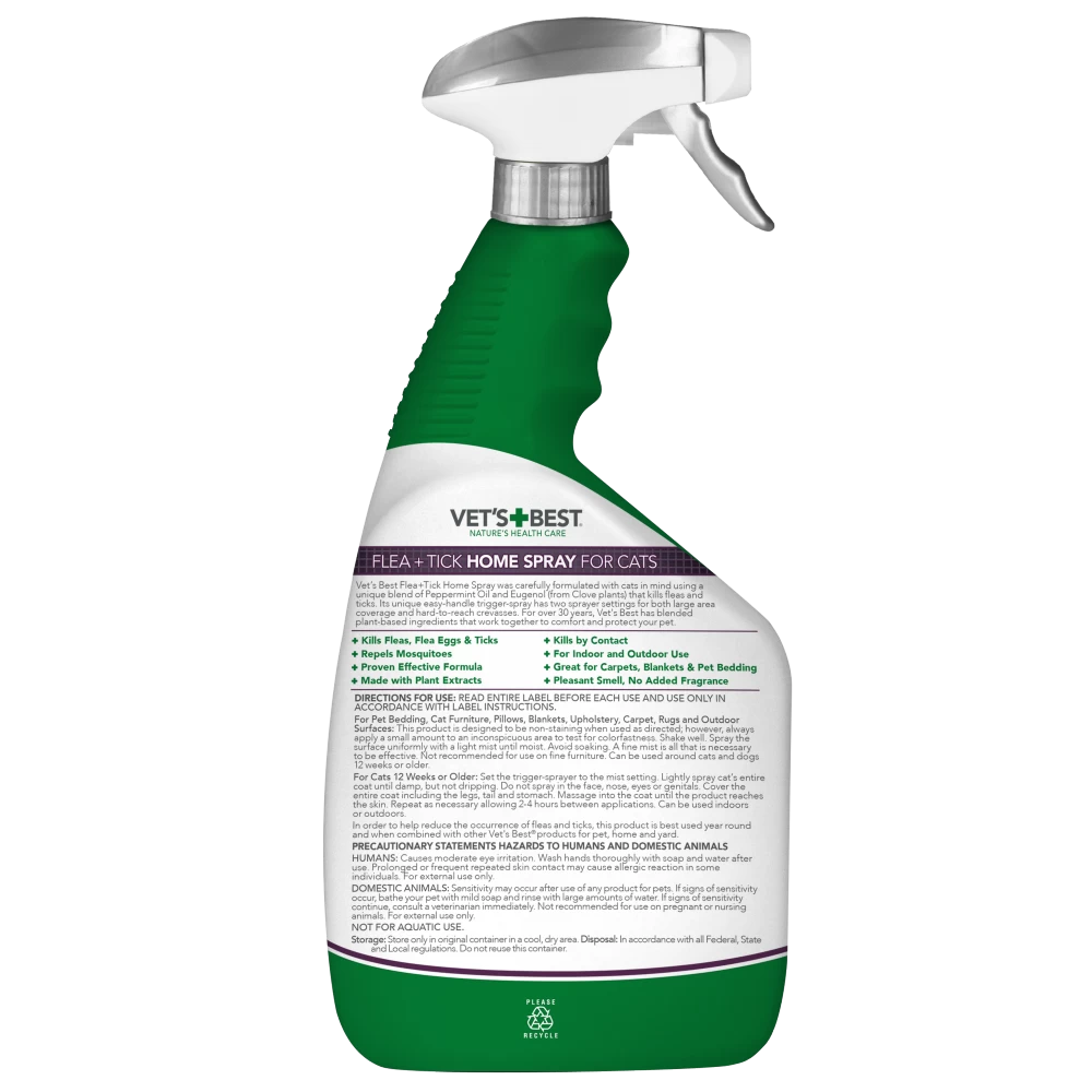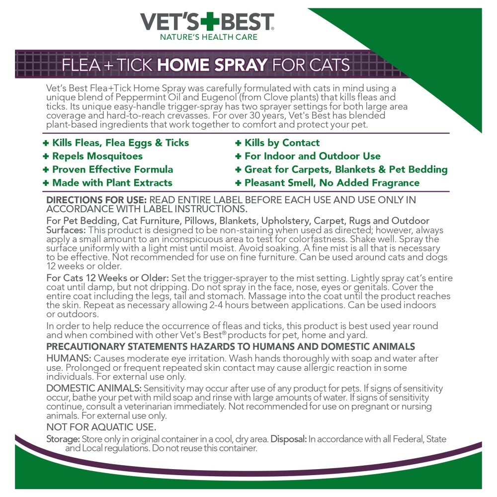 VET’S BEST FLEA AND TICK HOME SPRAY FOR CATS kills fleas, flea eggs, and ticks by contact. Our formula also repels mosquitos!
