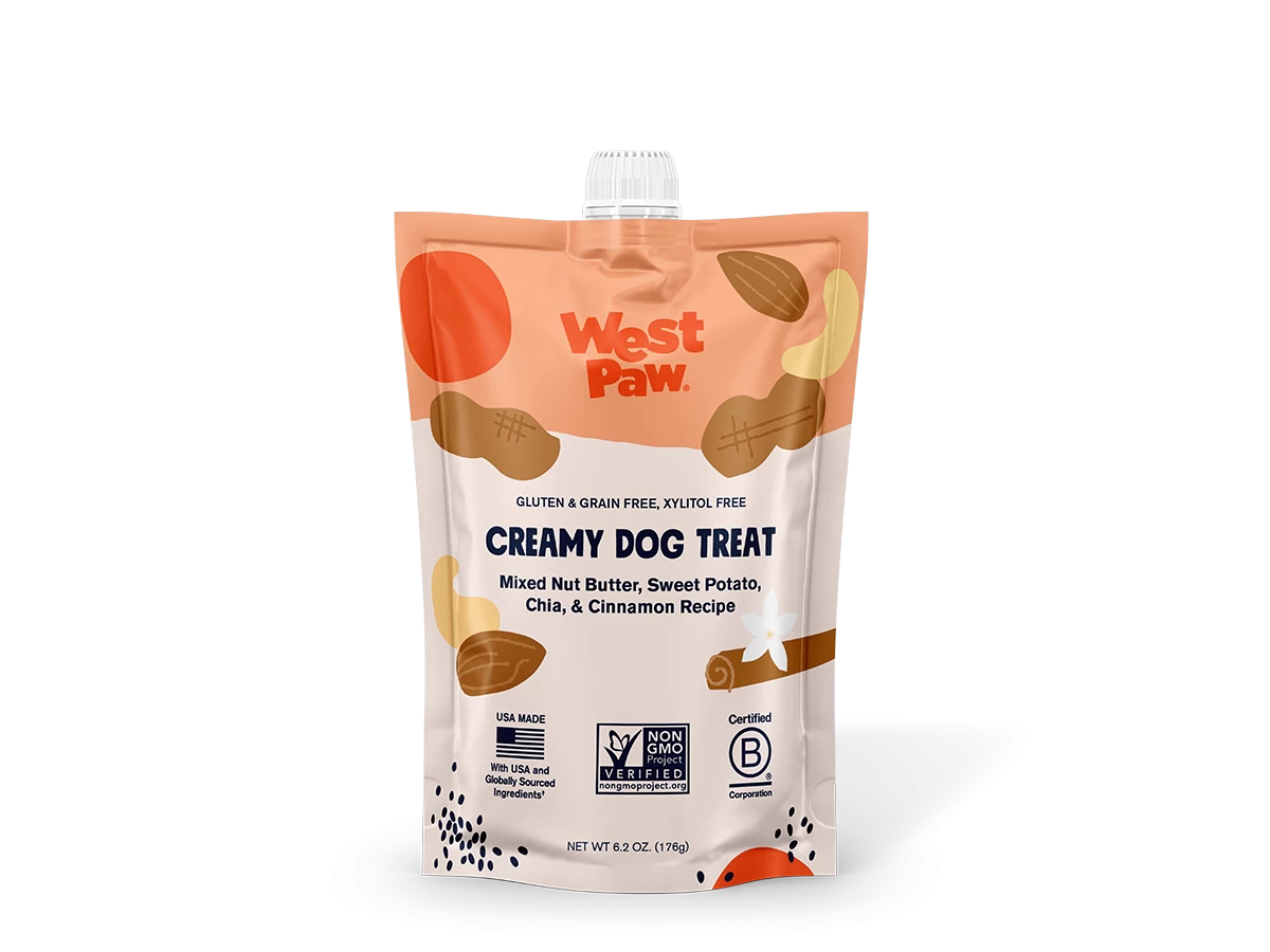 Humans love their nut butter, and so do dogs! West Paw mixed up creamy dog treats with fresh ground peanuts, almonds, cashews, sweet potato, and chia with a kiss of cinnamon – all in a mess-free dispenser. No sugar, no Xylitol, no preservatives, no artificial sweeteners, (or artificial anything) – just solid, simple nutrition for happy treating.