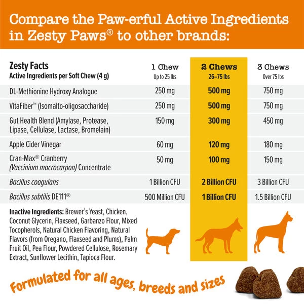 Active Ingredients: DL-Methionine Hydroxy Analogue, Isomalto-oligosaccaride (VitaFiber™), Digestive Health Blend (Protease, Amylase, Lipase, Cellulase, Papain, Hemicellulase, Bromelain), Apple Cider Vinegar, Cranberry Concentrate (CranMax®), Bacillus Coagulans, Bacillus Subtilis (DE111®).